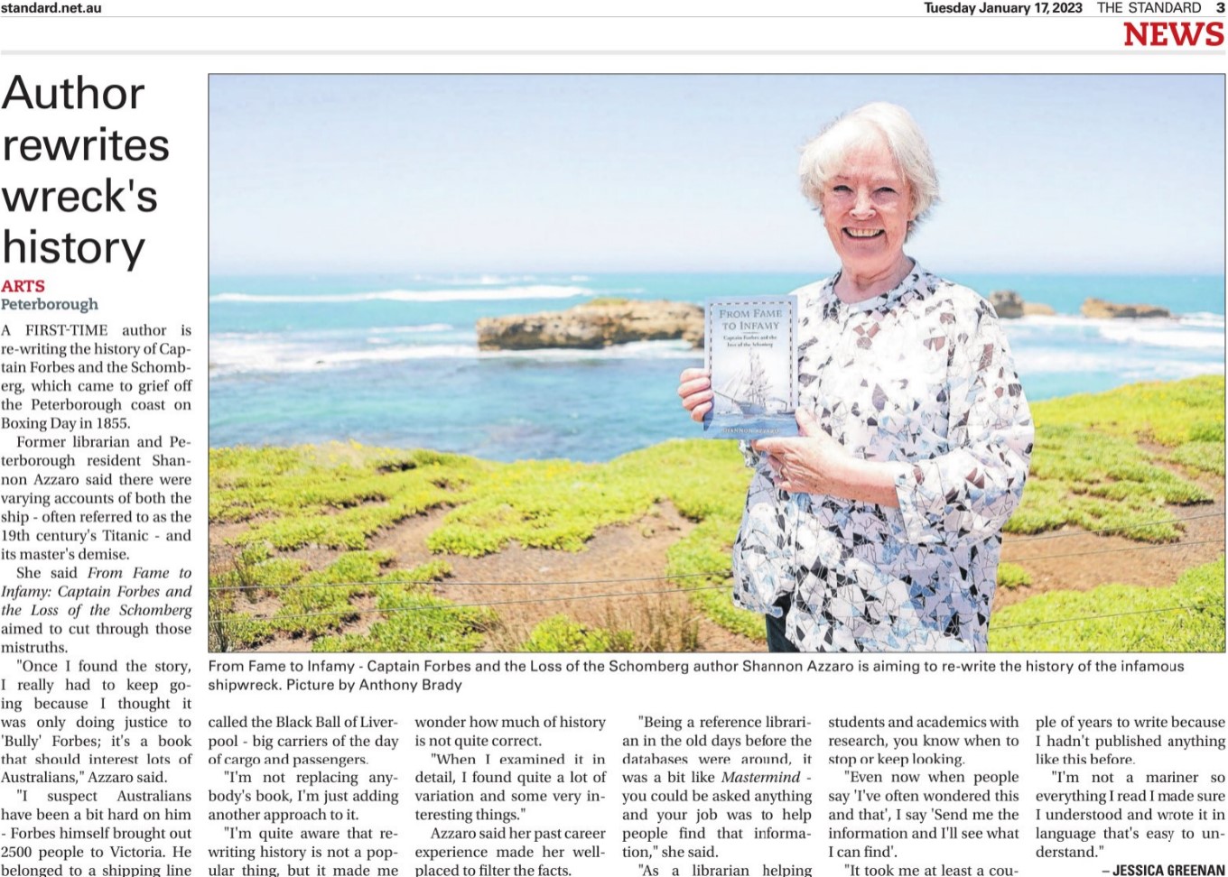 There was a buzz at the Peterborough launch of From Fame to Infamy: Captain Forbes and the loss of the Schomberg. The book tells how the Schomberg came to become shipwrecked off the coast of Peterborough and the aftermath. After the launch, the Warrnambool Standard got in touch and asked to interview the author Shannon Azzaro. They published the interview today. Such was the Standard’s dedication, they even asked Shannon to pose in front of the coastline where the wreck occurred!